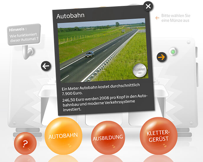 Developed a dynamic Flash-based application that visualizes how the German government allocates annual tax revenues across key investment areas. The interactive tool was launched across multiple social media platforms to increase public awareness and transparency.