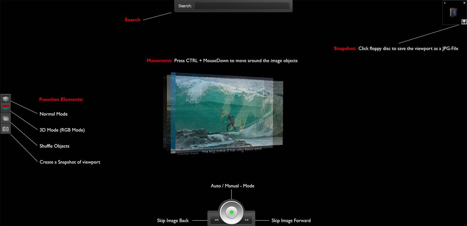 Images are layered with varying transparency to generate unique, randomized compositions. Additional features include RGB/3D view modes, sorting options, and the ability for users to save their creations as JPG files. This project served as both a technical training ground and a visual experiment in generative design and interaction.